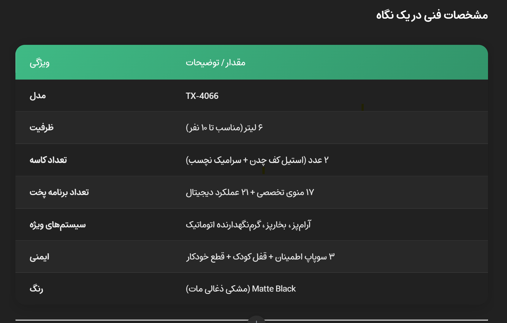 | ظرفیت | ۶ لیتر (مناسب برای ۸ تا ۱۰ نفر) |