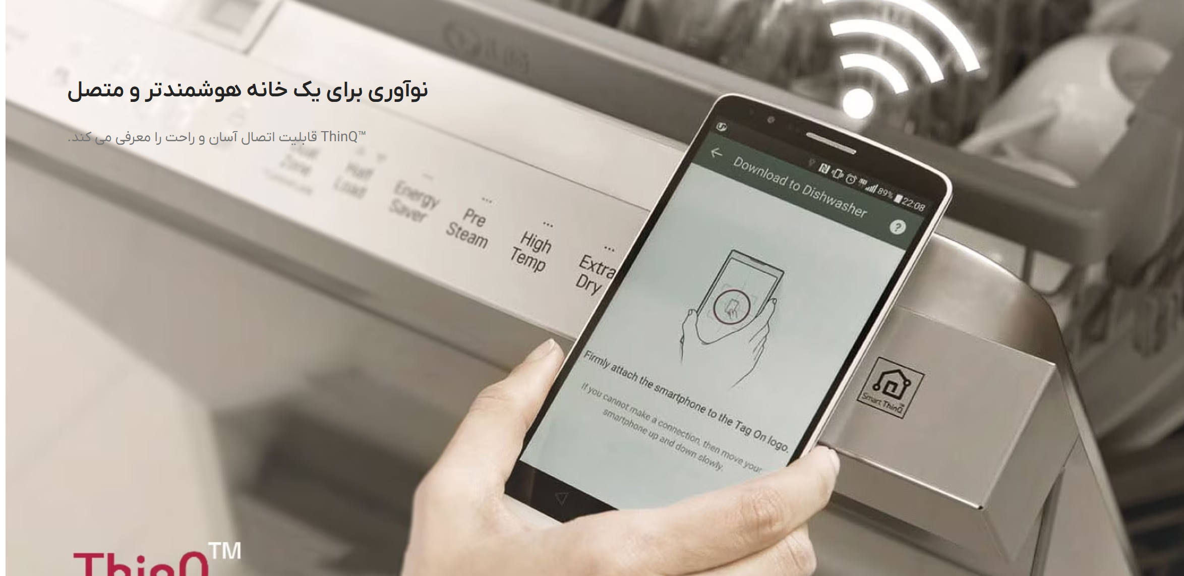 یکی از قابلیتهای هوشمند این ماشین ظرفشویی امکان اتصال به موبایل از طریق LG ThinQ است.