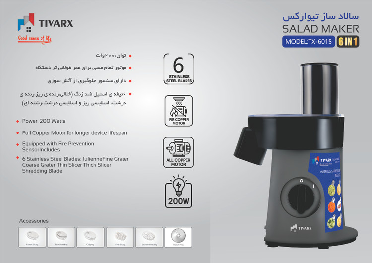 سالاد ساز تیوارکس مدل 6015 یک دستگاه ۶ کاره است که برای خرد کردن، رنده کردن و خلال کردن انواع میوه و سبزیجات استفاده میشود. این دستگاه ساخت کشور چین و تحت لیسانس فرانسه است و ۱۸ ماه گارانتی دارد. موتور آن ۱۰۰% مسی با توان ۲۰۰ وات است و دارای ۶ دیسک از جنس استیل ضد زنگ میباشد. این دستگاه دارای یک دهانه ورودی بزرگ برای قرار دادن انواع مواد غذایی است.