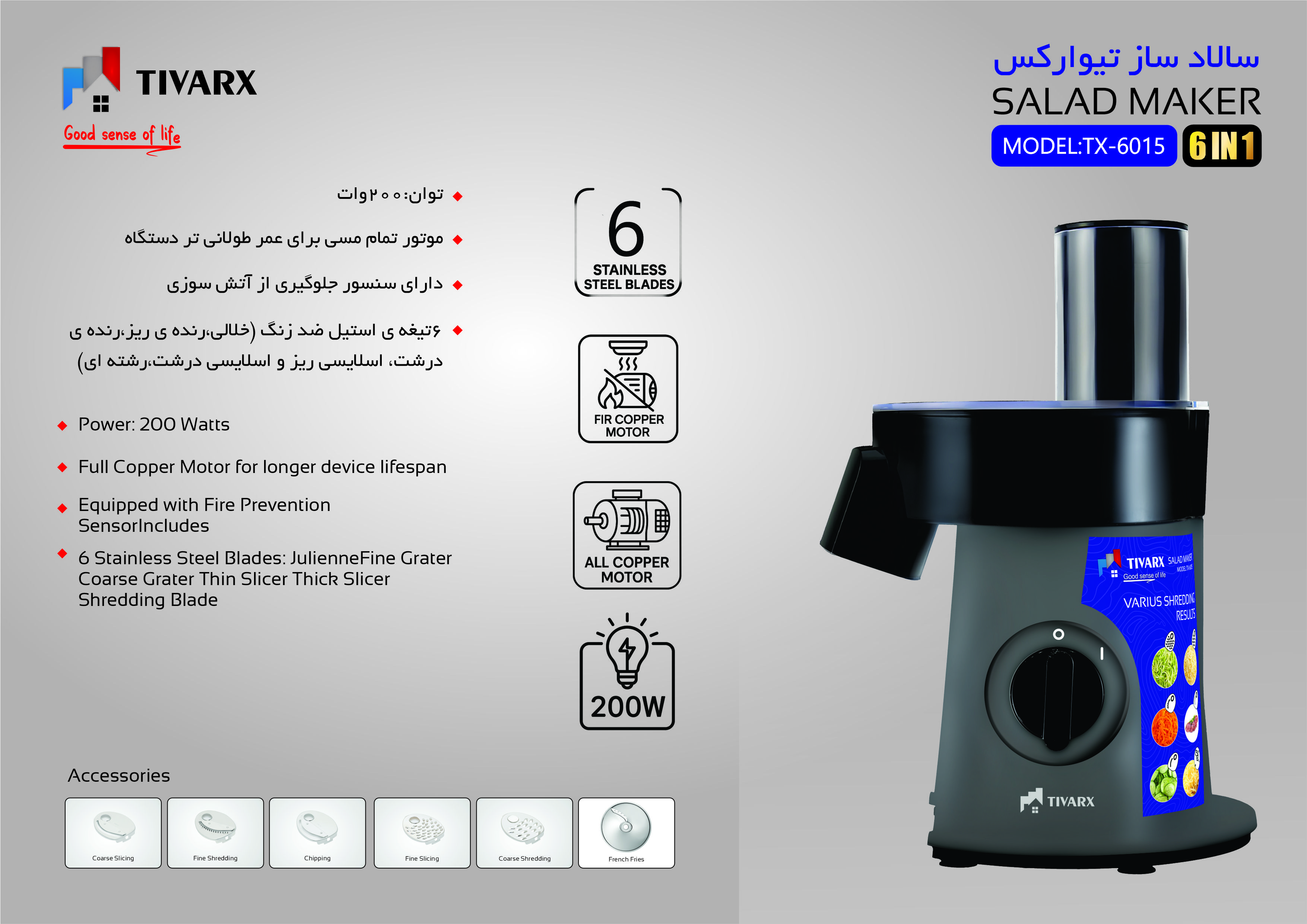 سالاد ساز تیوارکس مدل 6015 یک دستگاه ۶ کاره است که برای خرد کردن، رنده کردن و خلال کردن انواع میوه و سبزیجات استفاده میشود. این دستگاه ساخت کشور چین و تحت لیسانس فرانسه است و ۱۸ ماه گارانتی دارد. موتور آن ۱۰۰% مسی با توان ۲۰۰ وات است و دارای ۶ دیسک از جنس استیل ضد زنگ میباشد. این دستگاه دارای یک دهانه ورودی بزرگ برای قرار دادن انواع مواد غذایی است.